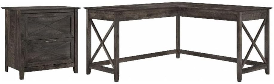 The Bush Furniture Key West 60W L Shaped Desk with Lateral File Cabinet turns any room into a practical home office with easy going style. At 60W x 60D, the durable work surface is spacious enough to spread out with a computer, paperwork and more when taking on your task of the day or just browsing the web. A sturdy post leg design and thoughtful construction with quality materials give the L shaped computer desk a weight capacity of 200 pounds. The 2 drawer filing cabinet opens on smooth full-extension ball bearing slides for an easy reach to legal and letter size documents, and it matches the height of the 30H corner desk to offer an extended work surface when placed side-by-side. Unique X pattern accents on side panels of the L Desk and the Cabinet's file drawers create a relaxed appearance that blends seamlessly with coastal and farmhouse decor. Choose from several casual finishes to find the perfect look for your home office or living room. Complete your personal workspace with coordinating products including a Mobile File Cabinet, 5 Shelf Bookcase and Desktop Organizers (all sold separately). This desk with drawers set is tested to meet ANSI/SOHO quality standards for safety and performance and is backed by the Bush Furniture 1 Year Manufacturer's Warranty.