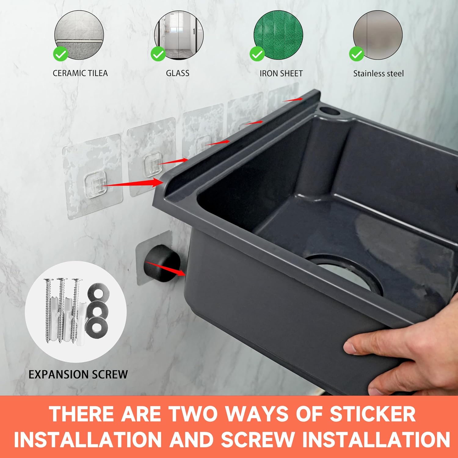 | Included Components | 1. plastic sink 2.Combination bracket 3.Strainer Basket drain hose (1m/40in) 4.Drain basket 5. perforated screws 6. adhesive patch + spare adhesive patch |