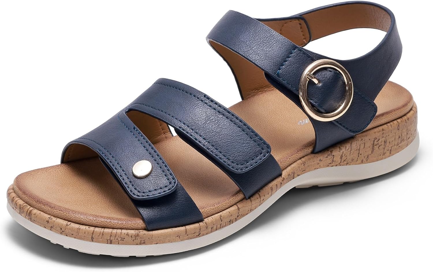 Designed for women seeking comfort and fashion sandals dressy: All-Day Comfort Womens Sandals: Featuring a cork-textured cushioned sole+skin-friendly leather insole+arch support, it offers comfortable support for prolonged wear—ideal for shopping, commuting etc;Versatile Styling Sandals for Women 2026: The minimalist light beige/black/blue/white/khaki leather, accented with metal buckles, pairs effortlessly with denim shorts for a casual look or dresses for a chic vibe, suiting various outfits.;Durable Craftsmanship: Neat stitching, wear-resistant leather, and fade-resistant metal details ensure long-lasting quality.Foot-Friendly Fit: The adjustable hook-and-loop design fits various foot shapes (wide or narrow) perfectly, delivering a comfortable wearing experience.